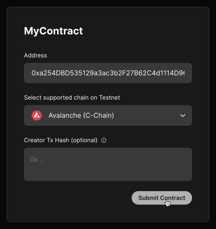 • Paste the contract address obtained from the deployment step into the designated input field.