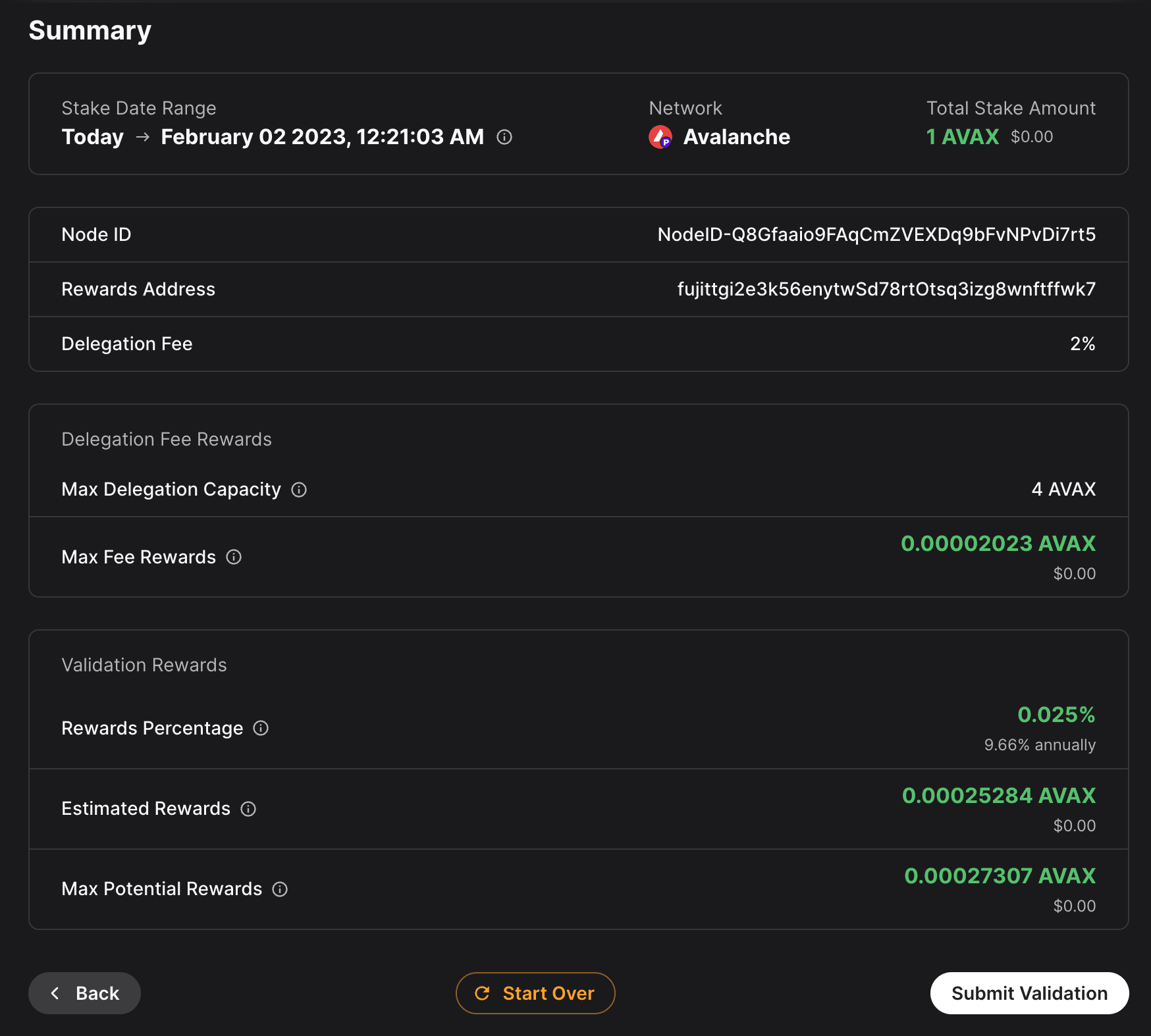 NodeIDwhich was returned in theinfo.getNodeIDresponse. In this example it'sNodeID-Q8Gfaaio9FAqCmZVEXDq9bFvNPvDi7rt5 - Staking End Date: Your AVAX tokens will be locked until this date.